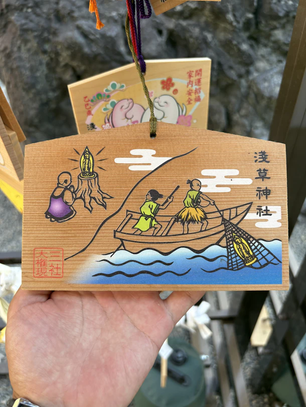 浅草寺の起こりは約1400年前。隅田川で漁をしていた檜前浜成・竹成(ひのくま兄弟)が観音様の仏像を網で掬い上げたことから始まります。その後、土師真中知がこれを深く信仰し、寺院が創建されました。観音様を祀る浅草寺と並び、その三人を祀るのが浅草神社です。浅草の信仰とまちの原点を伝える歴史が、この絵馬にも描かれています。