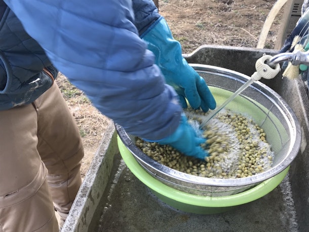昨年私たちが栽培した青大豆をよく洗ってから、たっぷりの水に明日の朝まで浸します。