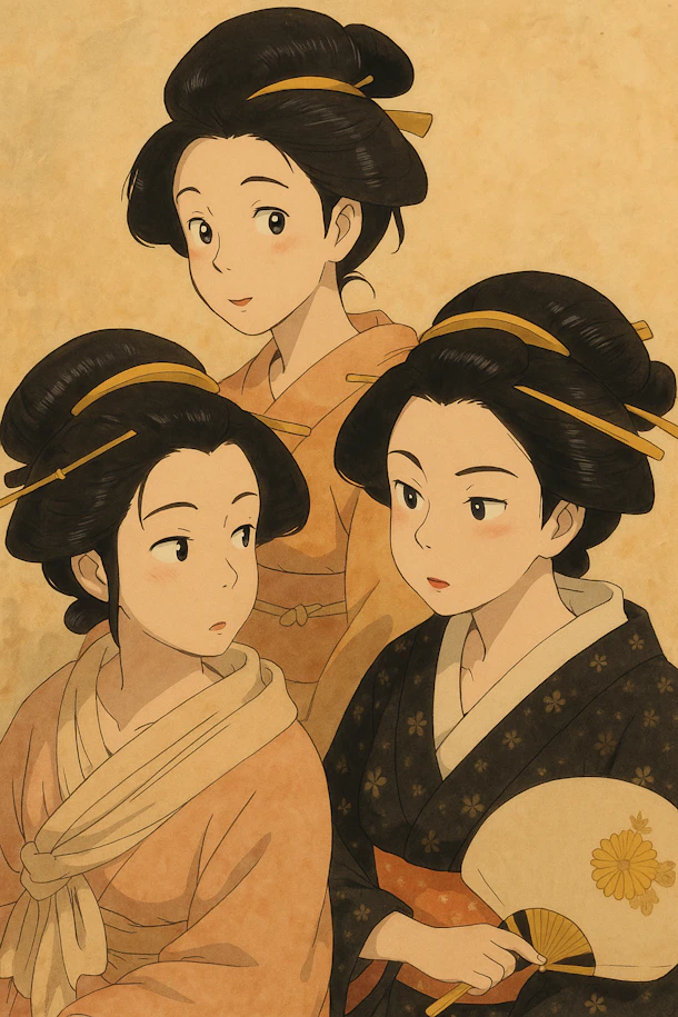 江戸の美人たちと浅草 ― 寛政三美人をジブリ風に