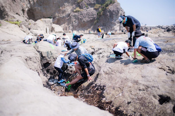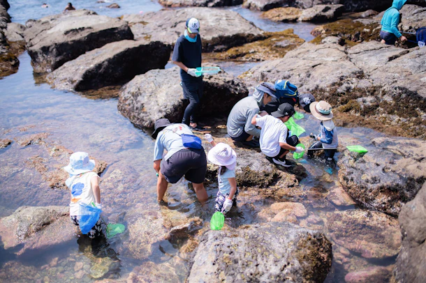 今年も猛暑が続く夏でしたが、夏だからこそできる体験を大切にしながら、休憩は室内でしっかりと取りつつ、江の島で磯遊びを楽しみました。今回の担当はアウトドアのプロである「みんなのアウトドア」さん。「磯遊びは初めて」というゲストの方も多くいらっしゃいましたが、プロの目で選び抜かれたとっておきの場所で、たくさんのことを教わりながら過ごしました。