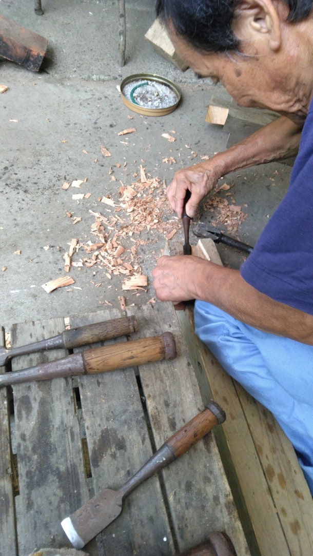 「大きい 重い 長いノミは掘るのに使う。平たい 大きいノミは仕上げの削りにいいよ」