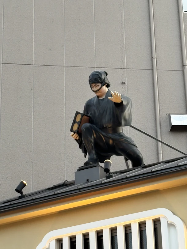 屋根の上の像は、歌舞伎俳優・中村勘三郎をモデルにしたもので、江戸の伝説と芸能が重なる浅草らしい見どころです。