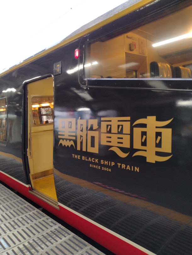 伊豆半島の電車にはリゾート21と言う、普通自由席電車が存在する。この電車が来ると、とても得した気分になる。黒船電車とキンメ電車(赤色)が存在する。こちらは黒船電車。