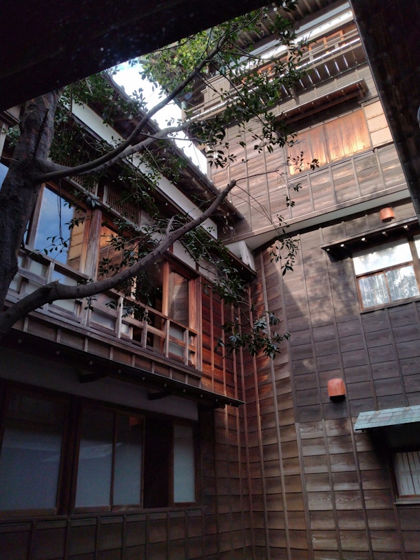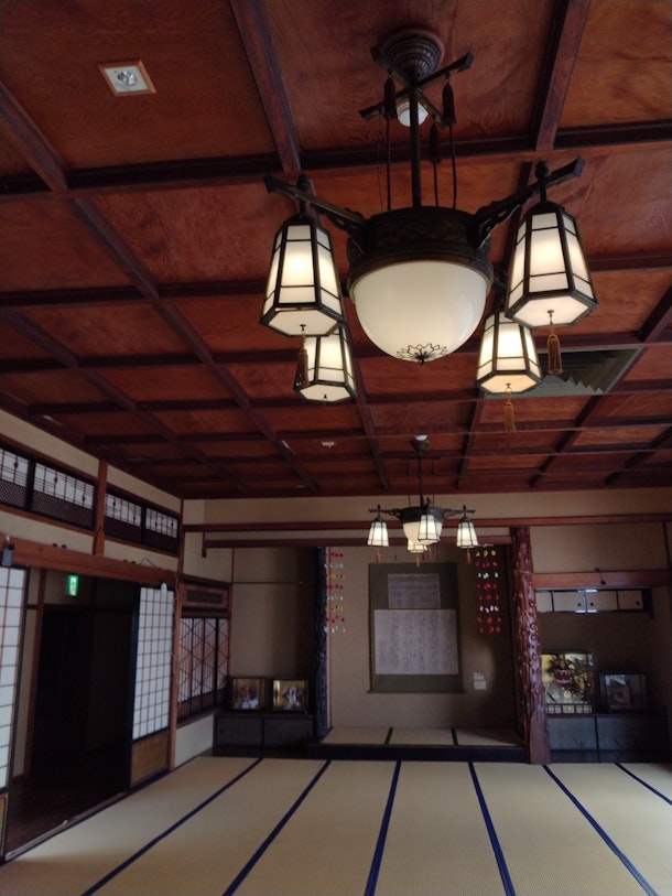但し、日帰り入浴は可能で、更に建物内の見学をする事が出来、木造建物の美しくも贅沢を施した部屋や彫刻、柱、障子や吹き抜けの中庭を見ることが出来る。