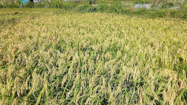 ※収穫時期の違う稲を植えてしまったため、水を抜かないまま稲刈りします。