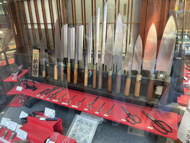 店内には和包丁から洋包丁までズラリと並び、一本一本に職人の技と歴史が宿っています。購入した包丁には、その場で名前を手打ち刻印してくれる名入れサービスもあり、自分だけの一本に仕上げられるのが魅力。観光のお土産としても人気です。