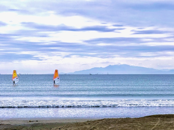 秋の材木座はサーファーやヨガの愛好家たちが 静かにを楽しむスポットです。