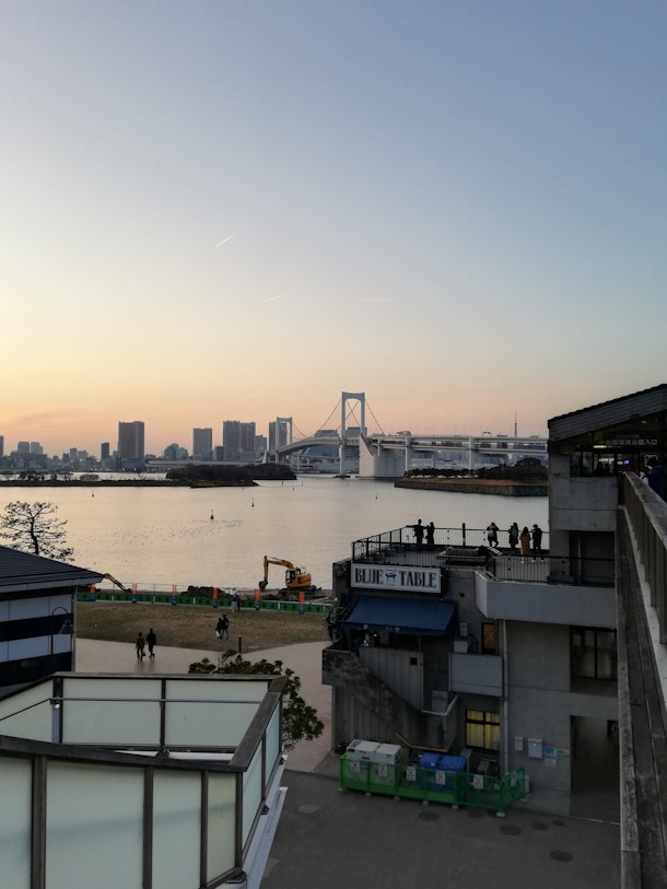 夕暮れにうかぶレインボーブリッジ。都会の光がともってきます。