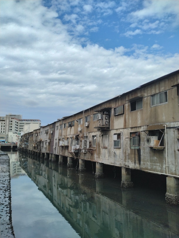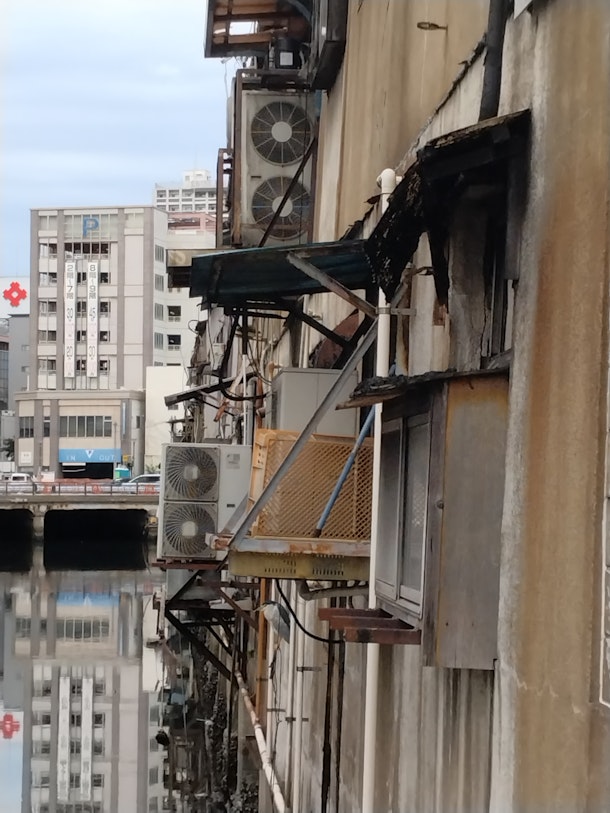 市場は神嶽川の東側に位置する。川の一部に建物が・・・。外観もレトロだ。