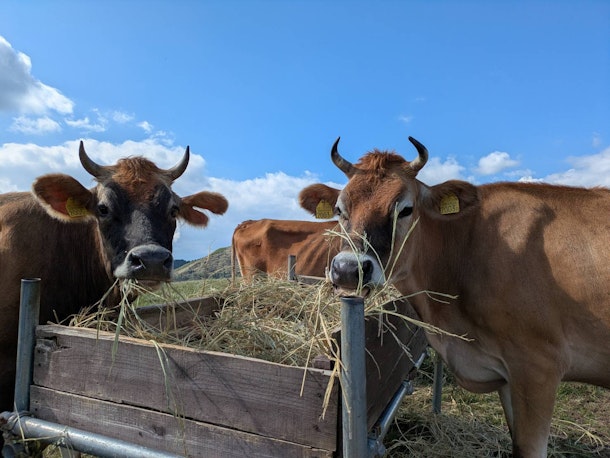 ここでは通年放牧で、冬場は草が出ないため田んぼの藁や夏場作った乾草を与えています。