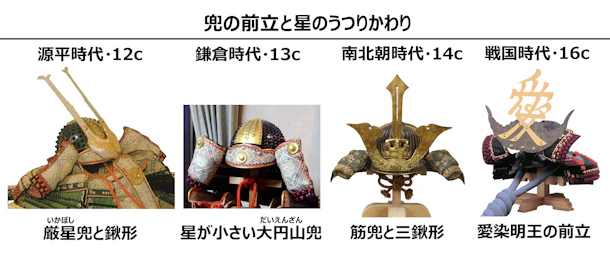 初期の兜には、大きな突起物が並んでいます。この突起物は「星(ほし)」といい、兜を形成する鉄板をつなぎ合わせる鋲が大型化したものなのですが、通説では敵の矢や太刀の直撃をかわしたり、衝撃を和らげたりする機能があったとされています。私は、この星には実用的な目的もさることながら、本質は梵鐘の上部にある突起物=「乳(ち)」と同じ意味があったのではないかと推理します。そして、梵鐘の乳は仏陀の螺髪(らほつ)を表しています。つまり、兜は仏の頭部を模しており、これをかぶる者は仏の加護が得られると考えられていたのではないでしょうか。兜の星は、時代が下るとともにだんだん小ぶりになり、最終的に消滅します。実は、この星が完全に消滅するタイミングに合わせるように、中央に仏具をあしらった三鍬形が登場するのです【画像9】。