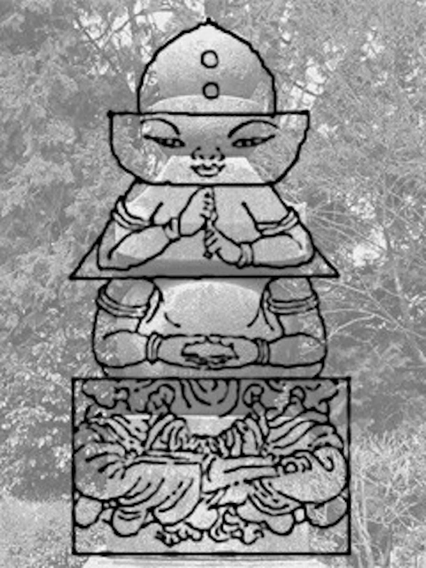 ここからは私の仮説となりますが、次の鳥羽上皇(後に出家して鳥羽法皇)は、こうした状況を打開すべく一計を案じたと思われます。 鳥羽法皇は、覚鑁(かくばん)という真言宗の僧侶に深く帰依し、彼を手厚く保護しました。覚鑁は、五輪塔の普及に大いに貢献した人物と言われています。五輪塔自体はすでに存在していましたが、覚鑁は、自著の中で、塔の姿を仏教(密教)の最高仏である大日如来が座禅して印を結んでいる姿とみなし、どのような仏を信仰していても成仏できる仏塔の形であると説きました【画像12】。その結果、五輪塔が宗派を超えて多くの人々に広まりました。また、初期の五輪塔は、「三角五輪塔」と言って、現在私たちが目にする五輪塔の屋根(傘)の部分のような反りのある四角錐ではなく、三角錐でした。