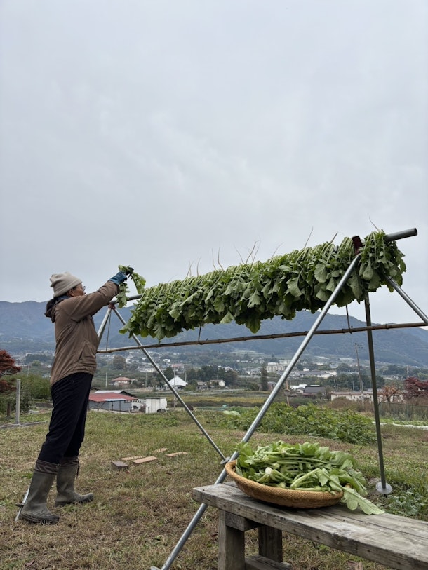 間引いてから、さっと洗って、少ししんなりするまで干したら、漬物に漬けました。