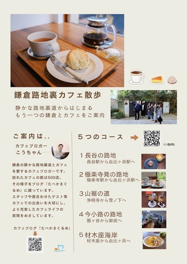 5つのコースがあるカフェツアー「鎌倉路地裏カフェ散歩」とカフェブログ「たべかまぐるめ」を紹介する紙パンフです。