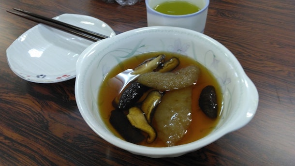 柚味噌、フキ味噌、シイタケ煮つけINコンニャク(朝の試し茹でコンニャクと煮こんでくれました!)