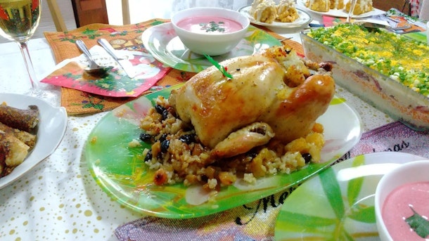 12月6日(土)11時から開催する「丸鶏のオーブン焼きとミモザサラダ!ロシア風のクリスマスとお正月会」