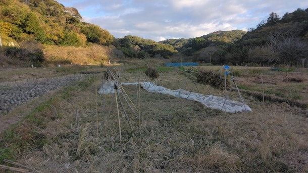 乾燥して弾けて下に落ちた大豆をキャッチするネットを張って