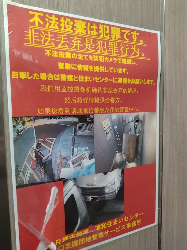 実際、足を運んでみたところ、団地に隣接したお店には、中華系などのお店が多く並んでいて、更に団地内部にも日本語以外の注意喚起の貼り紙などが設置されていた。
