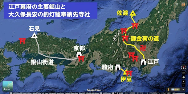 【画像1】 江戸幕府の主要鉱山と大久保長安の釣灯籠奉納先寺社分布図