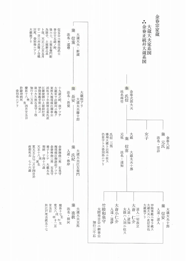 大久保長安は元々、奈良の春日大社や興福寺に奉仕する猿楽衆、大和猿楽四座のひとつ、金春座(こんぱるざ)の分家のひとつの大蔵家の出身でした。そして「金春」が屋号、「大蔵」が名字とすれば、本姓は秦氏(はたし/はたうじ)です。金春宗家に伝わる系図には、彼の名前は「大蔵太夫藤十郎 秦長安」と記されています【画像2】。彼の父親が武田家お抱えの猿楽師として甲斐国に招かれた際、長安は武田信玄にその資質を見込まれ武士に取り立てられました。ただし、兵士ではなく蔵前衆という鉱山開発や治水および税務など内政を司る組織の一員としてでした。そして武田家滅亡後は、内政手腕を見込まれて徳川家康の家臣となりました。長安自身は芸能の道を離れ、実務官僚としてのキャリアを築いていったわけですが、猿楽師として己の血筋を決して忘れることなく、その後も猿楽衆とは深い関係、否、むしろ積極的に猿楽の普及に尽力していました。