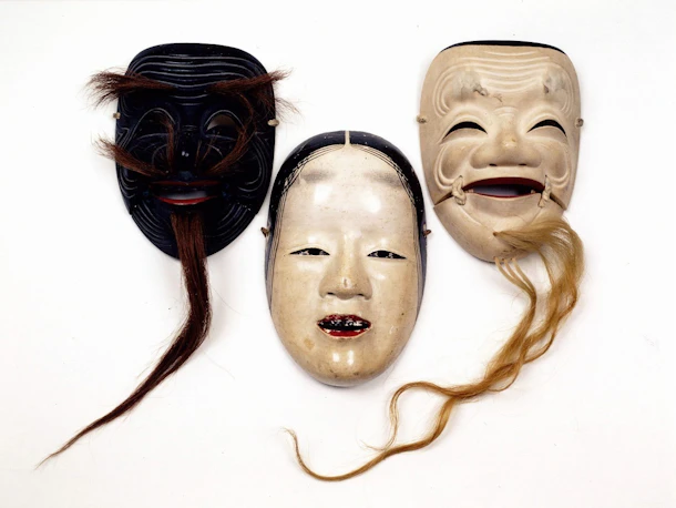 その一方で、銀山を経営する大森代官所の隣りにある城上神社(きがみじんじゃ、祭神:大物主命)には、長安は着任早々の慶長七年(1602)に神領60石を寄進しました。さらに同社には彼が奉納したという能面3面【画像3】が伝わっています。能面には、次に説明する「翁」で使用する白色尉(はくきじょう)と黒色尉(こくしきじょう)が含まれています。同社は大森の氏社ですので、これらが銀山経営の成功を祈願するものであったことは明らかです。しかし、同社には釣灯籠は伝わっていません。釣灯籠は散逸し、面だけが残ったとは考えられません。