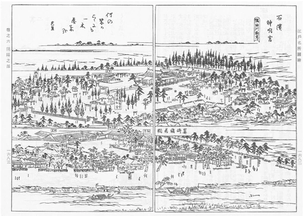 【画像2】 石浜神明宮(橋場明神)と真先稲荷社の境内の様子 『江戸名所図会』より