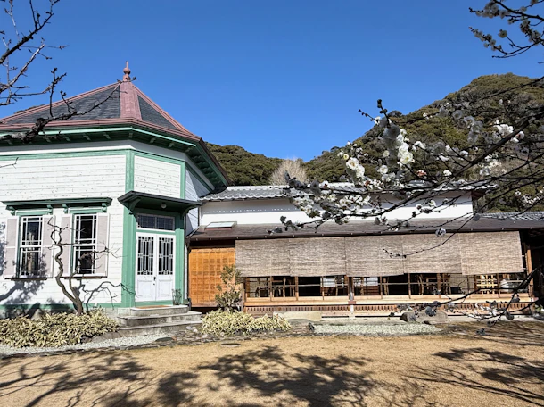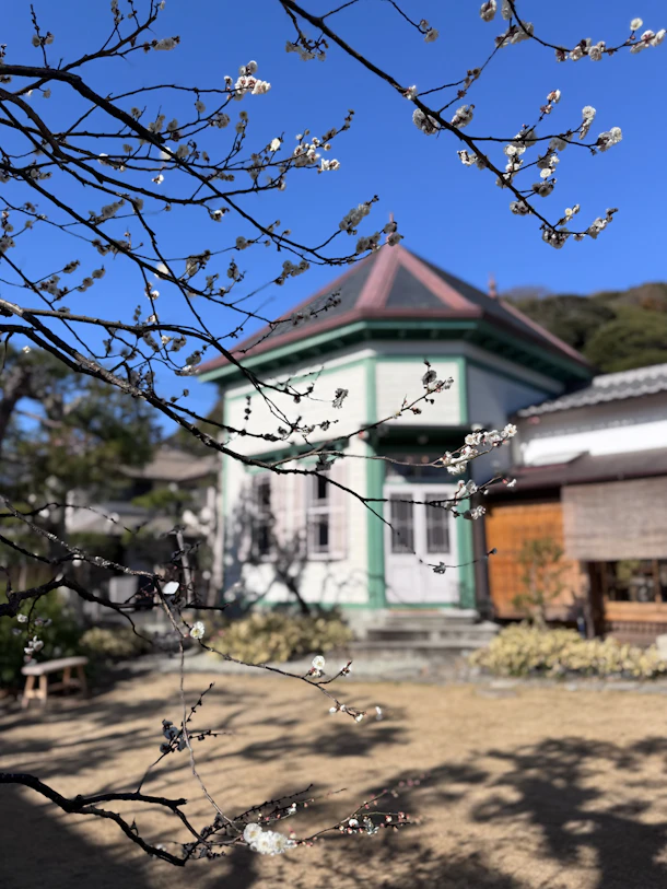 くっきりとした青空、甘縄神社の杜の緑をバックに凛と建つ旧加賀谷邸(北橋さん)はとても美しいです。