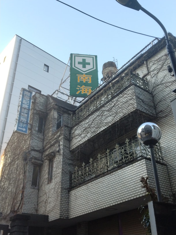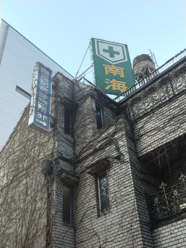 更に、外堀通り北側の細めの道を進んだ先には、とてつもなく古い建物(ある意味廃墟⁉)があり、看板には「南海」「南海記念診療所」と言う文字が掲げられている。