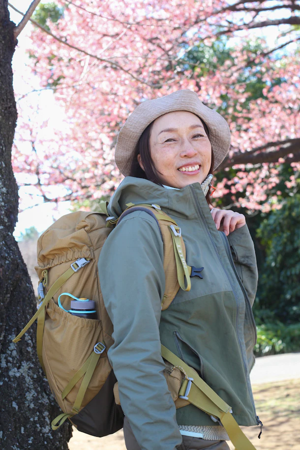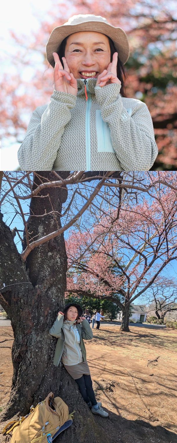 寒桜を背景に。上の写真のようにやや距離があるのですが、くじらのもりさんが「あのピンクの樹で撮りたいです」とのリクエストで移動しました。正直、距離がありますし、キャスターバッグを持って、土や芝生の上を移動するのはしんどいなぁ、と思ってしまったのですが、良いショットが生まれて良かったです。この点はくじらの森さんに感謝しています☆