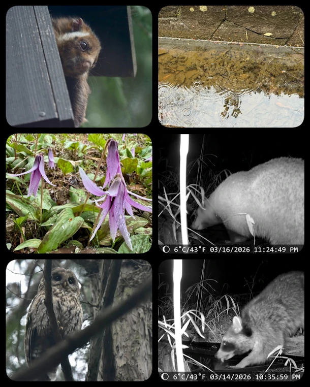 水場にはトレイルカメラをつけるとさまざまな種類の野鳥やニホンアナグマ・アライグマをはじめとする哺乳類が写ります!その様子は毎回取り付けたご家族に送ります📹