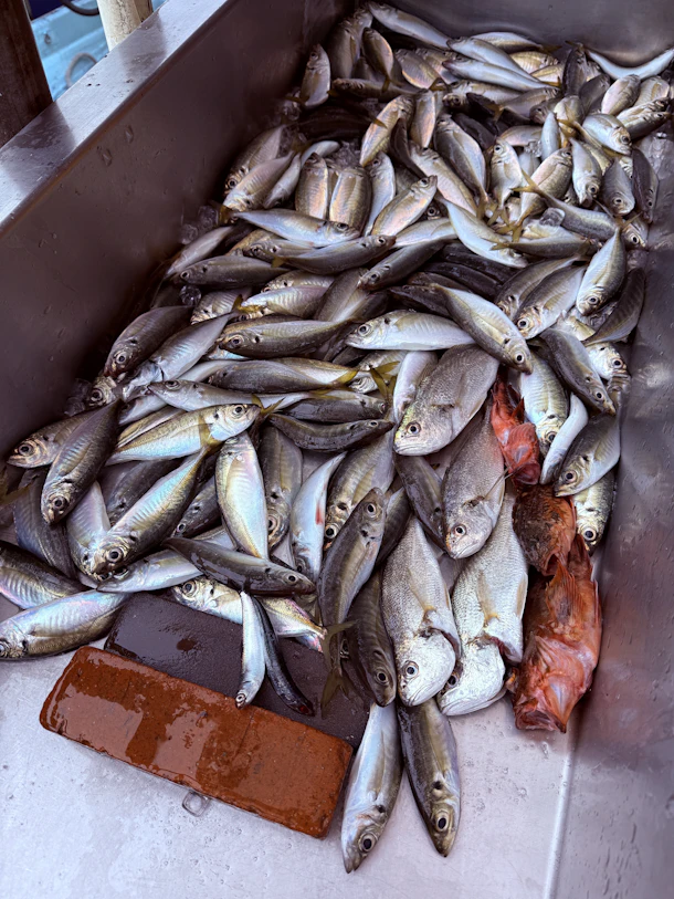 あたりはポイント移動後はひたすら続き、全体で150尾以上の釣果でした。釣れた魚は、マアジ、カタクチイワシ、シログチ(イシモチ)、カサゴです。