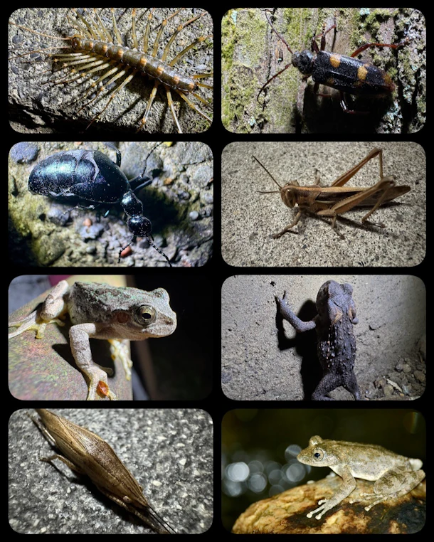 洞窟内にはアズマヒキガエル幼体・カマドウマもいて、下山中にはツチハンミョウ・ゲジゲジ・ヒガシニホンアマガエル・カジカガエル・サワガニ・タゴガエル鳴き声を確認できました!街灯にはツチイナゴやクビキリギリスがやってきていました🦗