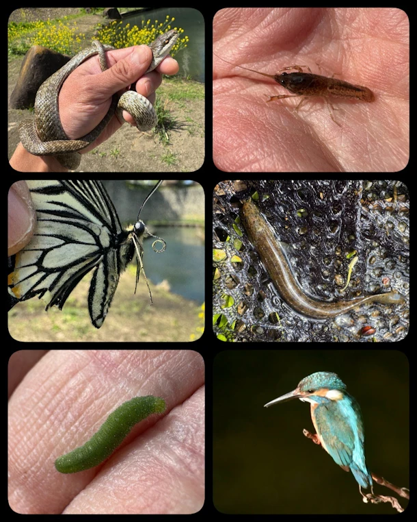 タニシ・ヌマエビ・アズマヒキガエルオタマジャクシ・スッポン・アメリカザリガニ・マドジョウ・カワニナ・オイカワ・アメンボ