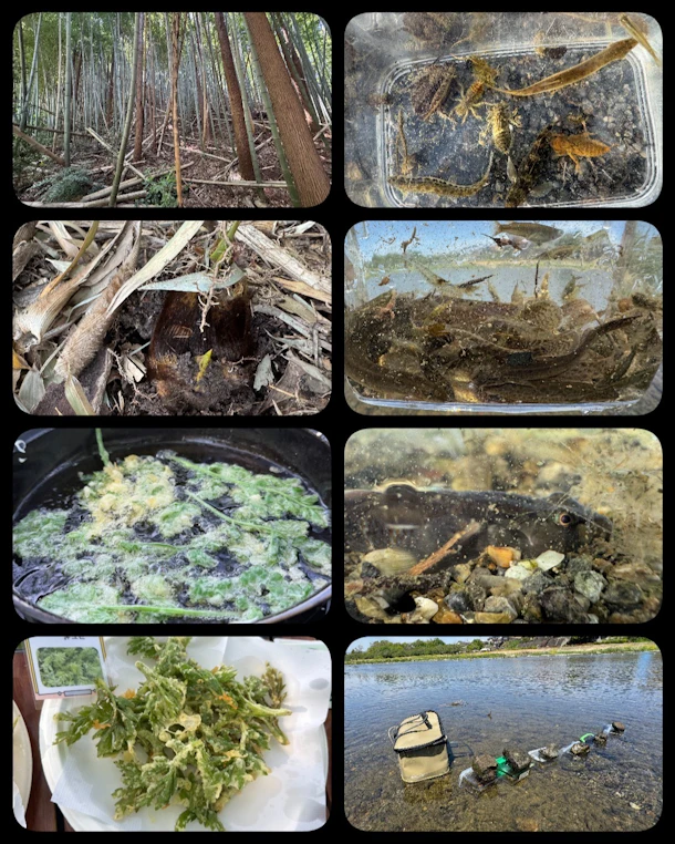 川に移ってから生えている野草を実際に観察して、手に取って、川に入りながら探して楽しいひとときを過ごすお母様も多かったです🌱 クレソン・ヨモギ・クズの芽・イタドリ・セリ・タンポポの花・スギナ・桑の葉・お茶の新芽・ノビルなど天ぷらタイムは河原の日陰で和気あいあいと贅沢な時間⏳ 野菜が好きではない子どもたちもどんどん楽しく、食べていました!