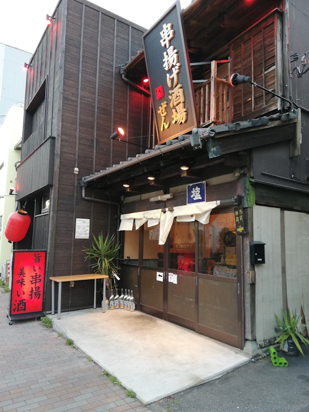 串揚げ酒場ぜんは、元酒屋の古民家と隣りの元床屋のハイブリッドで改装されてます。
