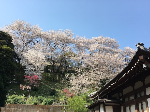 裏手の崖が一枚の絵のように桜、桃、菜の花が咲きそろって