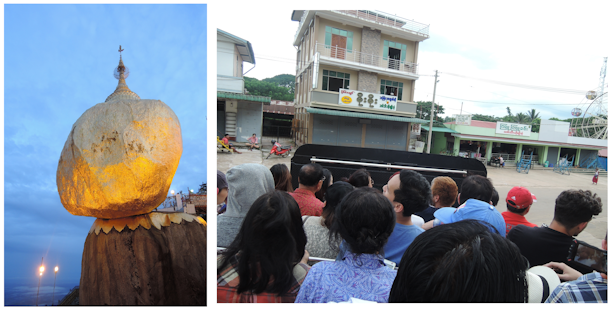 ゴールデンロック(チャイティーヨー・パゴダ)を訪れたときに乗ったピックアップトラックが超危険アトラクションさながらの乗り物だったことをトラベラーズカフェで紹介しました。↓下の写真のように、トラックの荷台に25人くらい乗せられて、未整備の山道を20分くらい爆走しました。いつか曲がり角で遠心力にやられて人が荷台から飛び出してしまうと思います。