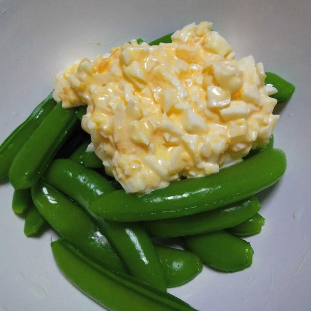 スナックエンドウが沢山採れたので、茹でて手作りタルタルソースをかけて楽しんでいます。おすすめです。