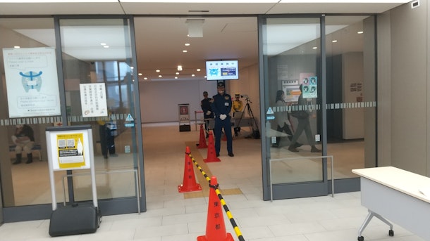 管理棟入口の写真。一般人は消毒して、検温して入ります。