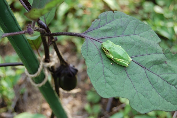 ナスの葉っぱにアマガエル。