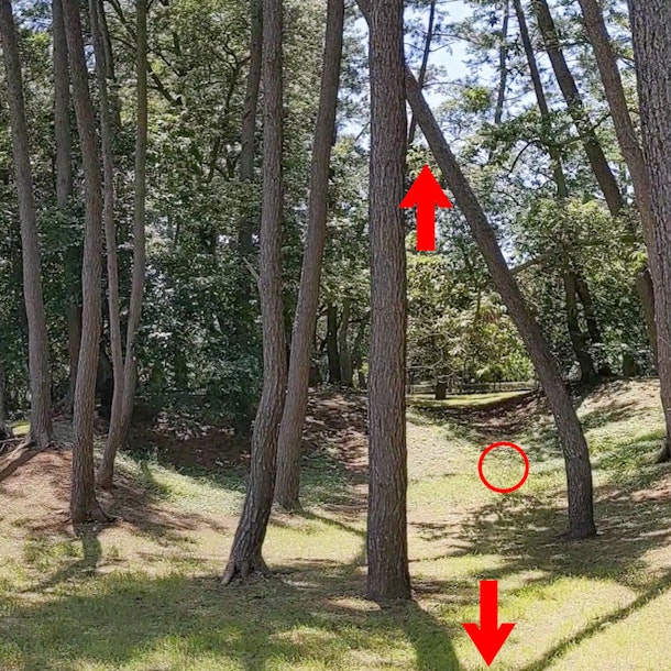 この場所は、ウォーキングで訪れる公園なのですが、天気や時間帯によって、その姿は違います。梅雨の晴れ間で、緑が綺麗だったこの日、歩きながらでも残しておきたい光がありました。実際に撮影した箇所を矢印と丸印で示しました。