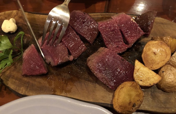 - ・前菜や鹿肉ステーキに、ゲストさんがワイン通(ソムリエ資格)で、とてもさっぱりした美味しい赤ワインのボトルを注文。微炭酸の赤ワインが美味しくてボトルはすぐ空になる。このお店はハウスワインも美味しいので、白ワインをデキャンタ(ボトル相当)で追加。前菜もステーキもワインも美味しい。環境悪く、打ち解けられなかった一軒目と違い、お酒の力も借りて徐々に盛り上がりつつある