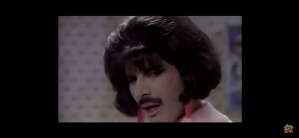 すかさず、機転の効くゲストさんの選曲「自由への旅立ち (I Want To Break Free)」のミュージック・ビデオでのガチ・カツラの女装+リアルちょび髭に衝撃を受ける。フレディは真剣そのもの。