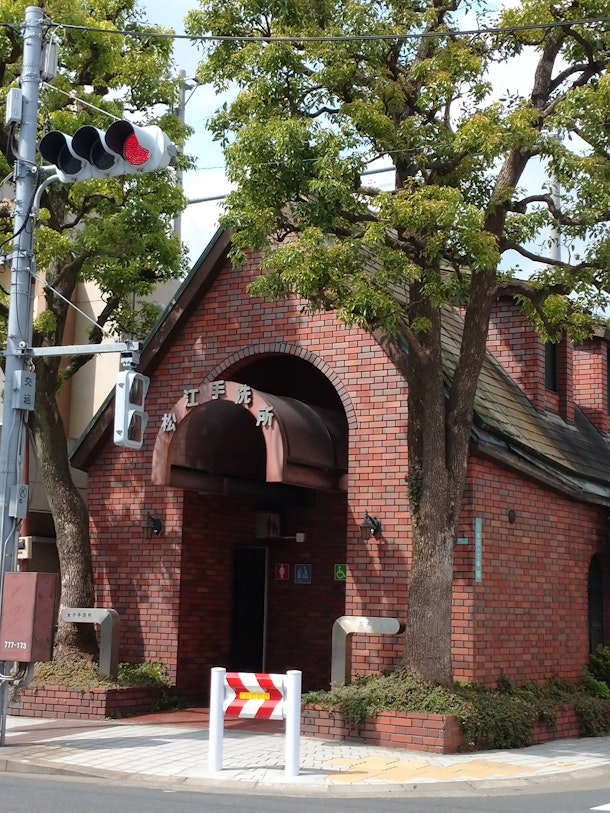 見よ!!この洗練された外観。ベルタウン松江商店街に存在するレンガ造りの公衆便所・・・・お洒落だ‼しかも手洗所って言う表記も素敵すぎる。