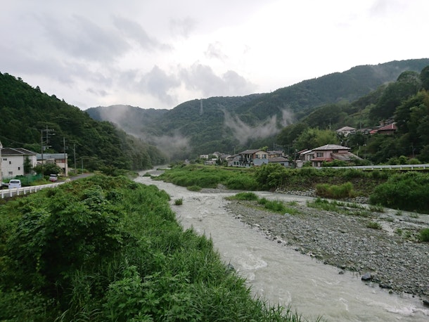 (寄(やどりき)の真ん中を流れる中津川。ここのところの雨で濁ってます)