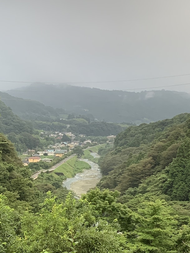(お邪魔したお家の庭からは中津川の清流を見下ろせる。早く天気になれー!)