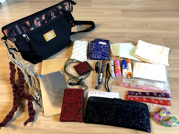 例えば私は、保育園の送り迎えやスーパーへの買い物など、近所へのお出かけならこんなポシェットに必要だと思う防災グッズをまとめていて(写真の中に入ってないものもありますが)