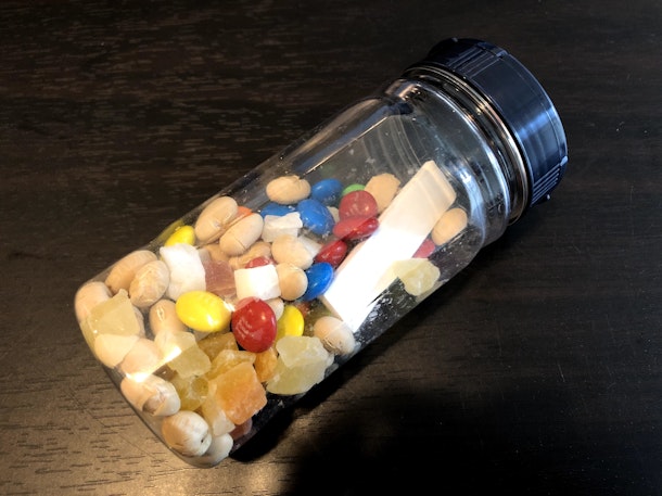 例えば、私はこういうボトルに煎り豆とチョコとドライフルーツを入れて仕事の合間やちょっと小腹がへったときにつまんだりしています。
