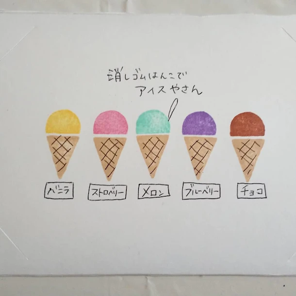 親子消しゴムはんこ体験では、アイスやすいか、朝顔のはんこを作ります。