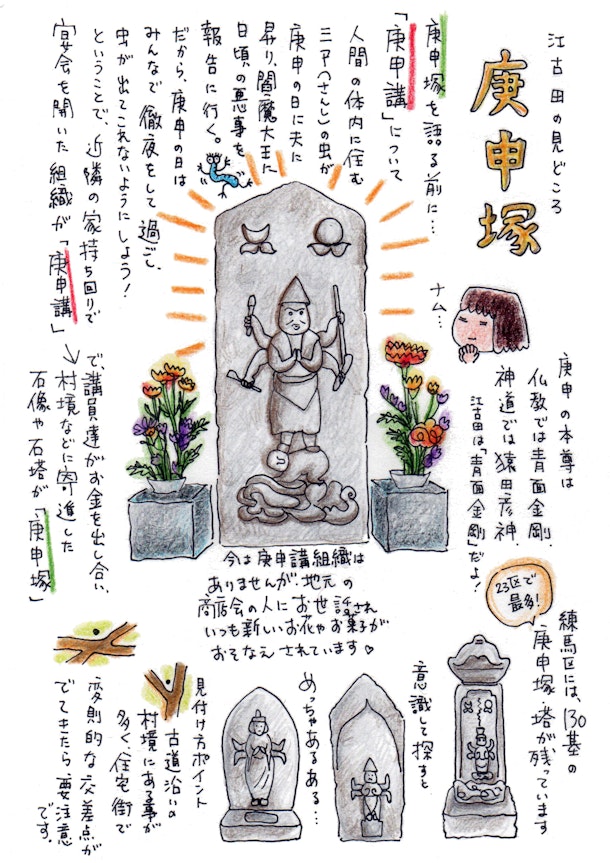 今日は、江古田ゆうゆうロード沿いに建つ「庚申塚」をご紹介します。 今は色レンガが敷き詰められ、のんびり歩ける商店街になっていますが、 この道はもともと江戸から埼玉県戸田市の辺りを結ぶ古道「埼玉道」でした。 ツアーでも立ち寄りますので、どうぞお楽しみに! 練馬区には庚申塚、庚申塔が多く残っていますが、新しい木造の祠に納まり、お供え物の絶えないこの塚はとりわけ大切にされていると感じます。
